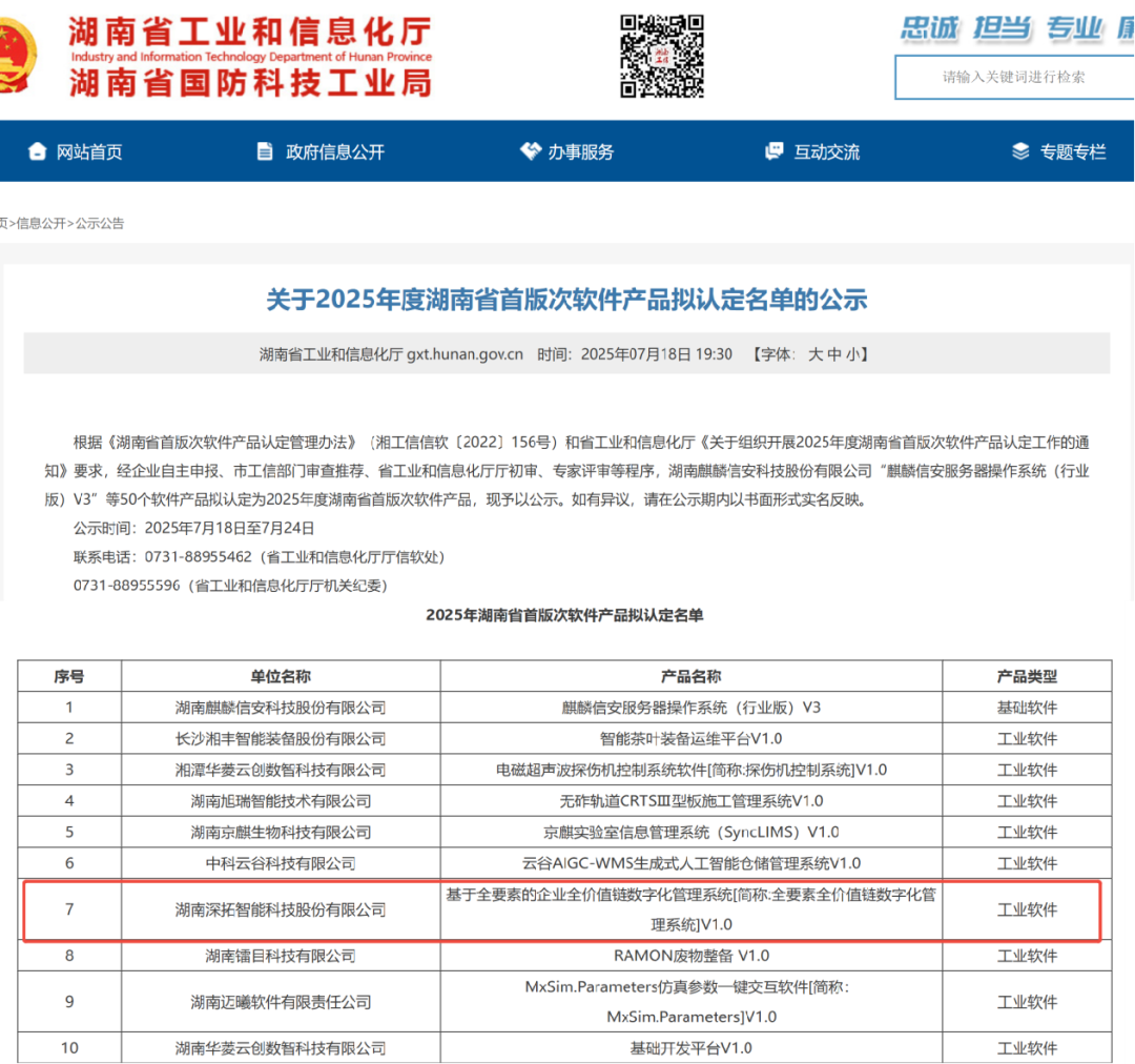 近日,湖南省工業(yè)和信息化廳依據(jù)《湖南省首版次軟件產(chǎn)品認(rèn)定管理辦法》(湘工信信軟〔2022〕156號)以及《關(guān)于組織開展2025年度湖南省首版次軟件產(chǎn)品認(rèn)定工作的通知》要求,經(jīng)過企業(yè)自主申報、市工信部門審查推薦、省工業(yè)和信息化廳初審、專家評審等一系列程序,湖南深拓智能科技股份有限公司“基于全要素的企業(yè)全價值鏈數(shù)字化管理系統(tǒng)(簡稱:全要素全價值鏈數(shù)字化管理系統(tǒng))V1.0”等50個軟件產(chǎn)品擬認(rèn)定為2025年度湖南省首版次軟件產(chǎn)品。